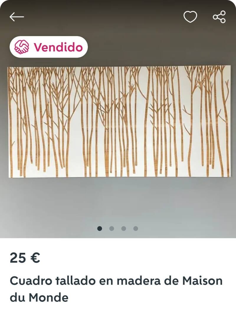 Os dejo un ejemplo de este cuadro tallado en madera por solo 25€ que encontramos hace tiempo y que por sus colores y estilo sencillo, encajaba en multitud de estancias del proyecto.